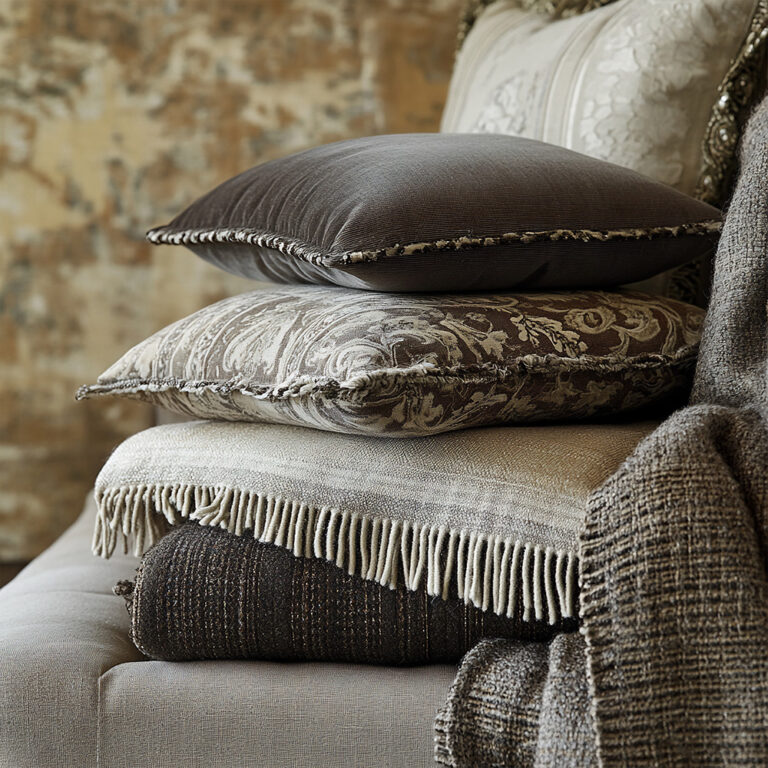 Сочетание различных текстур: шероховатость льна, мягкость бархата, рельеф вышивки или принтов придают пространству глубину и характер.